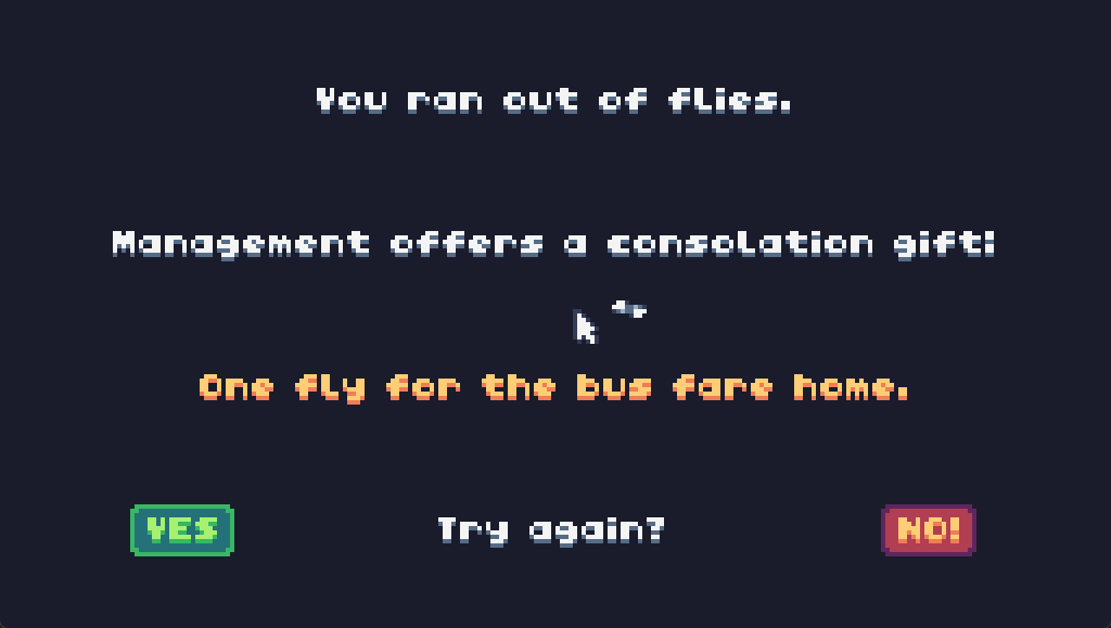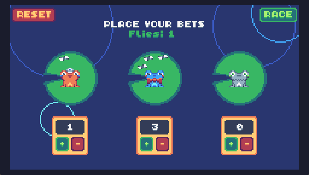 Controls: Use your mouse to select how many flies to bet on each frog. You can bet as few as 1 fly, or all of them if you feel like it! When you're ready, click "Race."